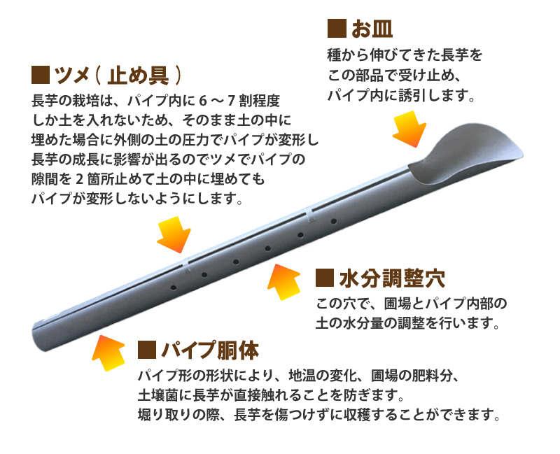 ![]() ![]() クレバーパイプ 長芋用 詳細はこちら | 中に土を入れた状態で土中に埋めて栽培し、 このパイプの中で、長いもが育ち、パイプごと 簡単に取り出すことができるので収穫時長芋を 傷つけず簡単に収穫できます。 |