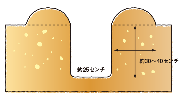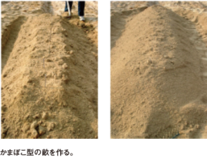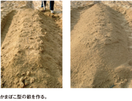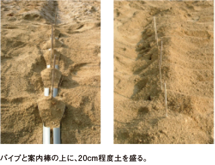 パイプと案内棒の上に土を20cm程度盛って畝を作る。
