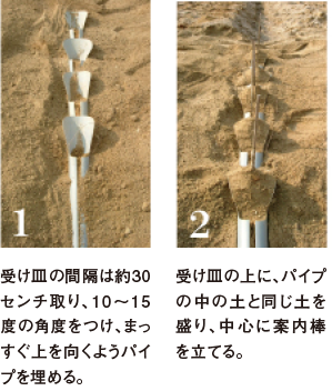 お皿(受け皿)とお皿(受け皿)の間隔を30cm程度取り、10~15度の角度を付けてクレバーパイプを埋めていく。このとき、お皿が真っすぐ上を向くように注意してパイプに詰めた土と同じものを盛る。