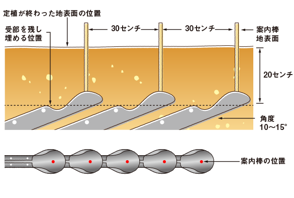 ・種芋の植え付けの際、案内棒を目安に植え付けを行います。