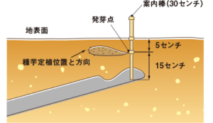 種芋発芽点を案内棒に添わせるようにして5cm覆土する