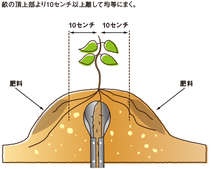 定植後すぐに元肥として施肥を行う。撒く際は畝の頂上部から10cm以上離すようにする。