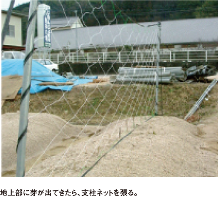 芽が地上部に出てきたら支柱を立ててネットを張る。土の上にツルを這わせると病害の原因にもなるのでこの作業はなるべく早めに行うことが重要。