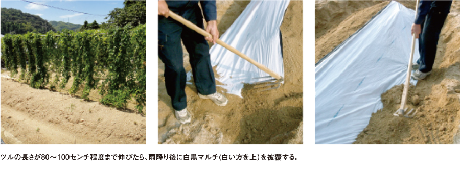 定植後30~40日経過した頃、ツルが80cm以上に伸びていたら雨が降った後を見計らって白黒マルチの白い方を上にして被覆をする。