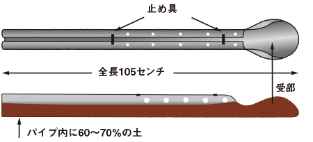 長芋栽培の場合、そのまま土の中に埋めると外側の土の圧力でパイプが変形し長芋の成長に影響が出てしまいます。なので、パイプ内の土を6~7割程度にし、ツメで2カ所固定し、土中でもパイプを変形しにくくします。