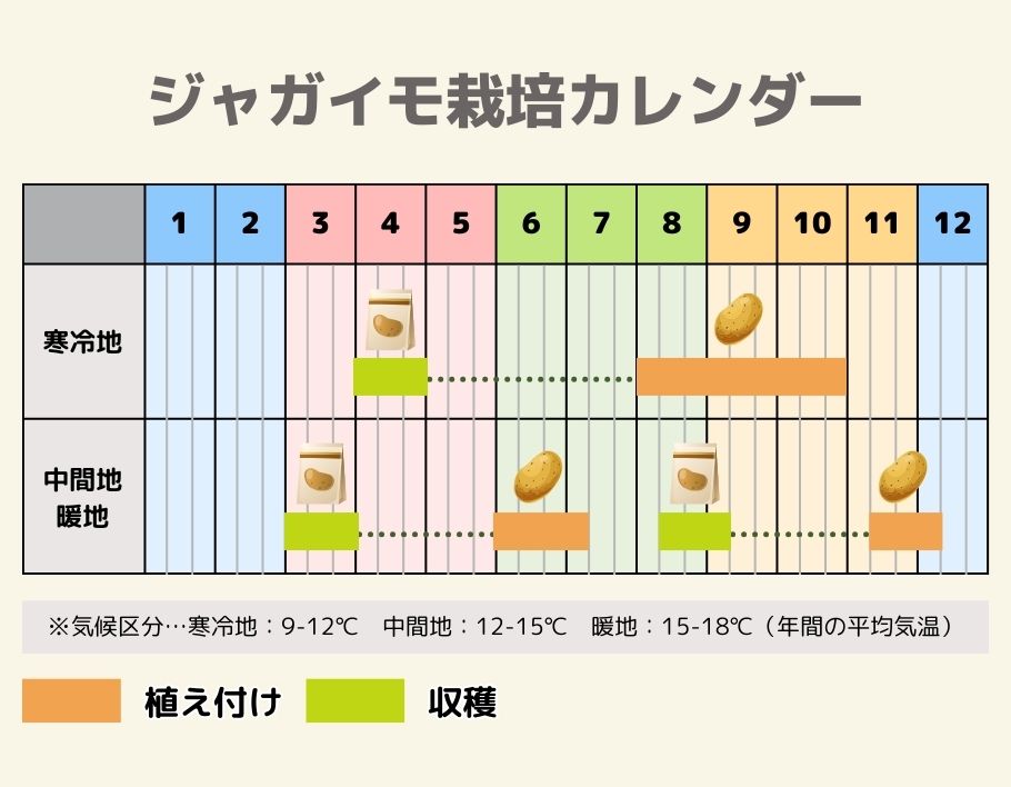 品種にもよりますが、ジャガイモ栽培には春作と秋作があり、1年で2回の栽培期間があります。春作は3月ごろ植え付けて6月に収穫秋作は8月ごろ植え付けて11月に収穫するイメージです。